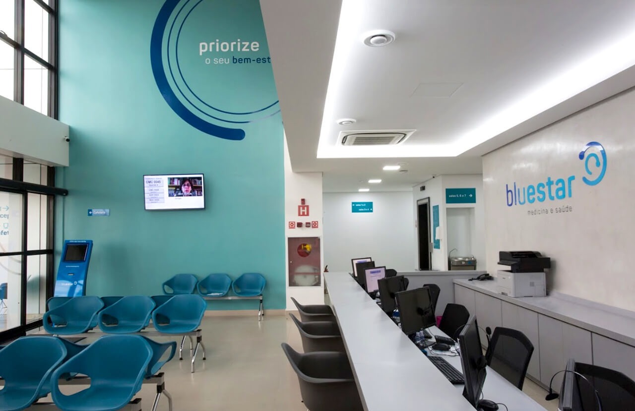 Esse novo posicionamento foi expandido para o espaço físico da clínica por meio da sinalização interna e materiais institucionais, garantindo coerência entre marca e ambiente. O resultado é uma experiência mais estruturada, intuitiva e alinhada à nova fase da BlueStar.