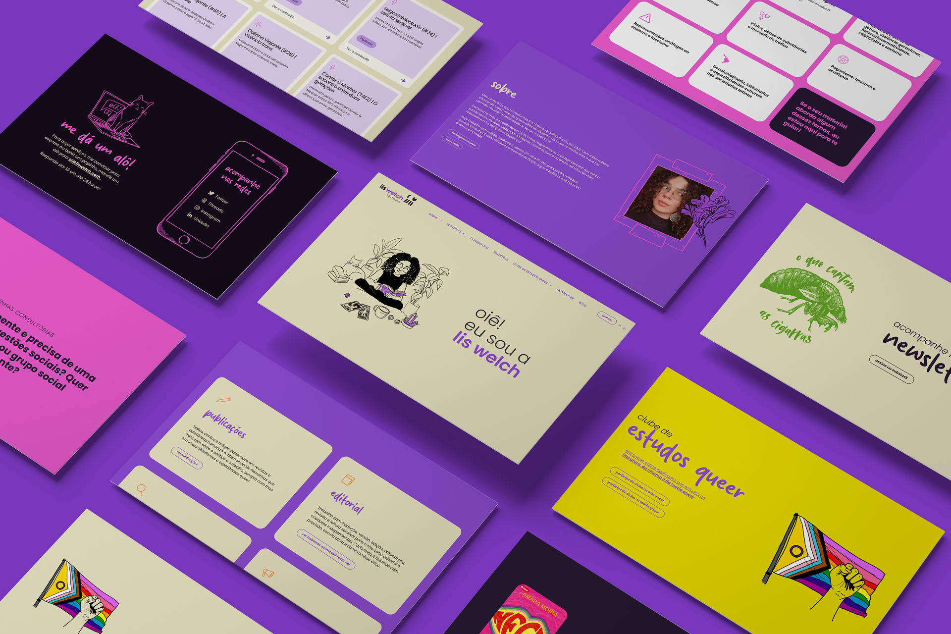 O projeto para Lis Welch partiu da construção de uma identidade visual capaz de refletir a centralidade da linguagem em seu trabalho. A marca e o sistema visual foram desenvolvidos com foco em clareza, ritmo e sensibilidade tipográfica, criando uma presença contemporânea que valoriza o texto como matéria-prima. O site organiza sua trajetória e serviços de forma direta e legível, equilibrando funcionalidade e expressão visual. A identidade se estende em um sistema flexível, pensado para acompanhar a diversidade de frentes em que Lis atua, da edição e tradução à escrita e consultoria cultural.